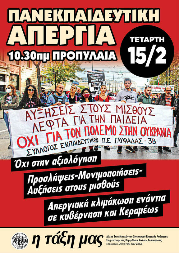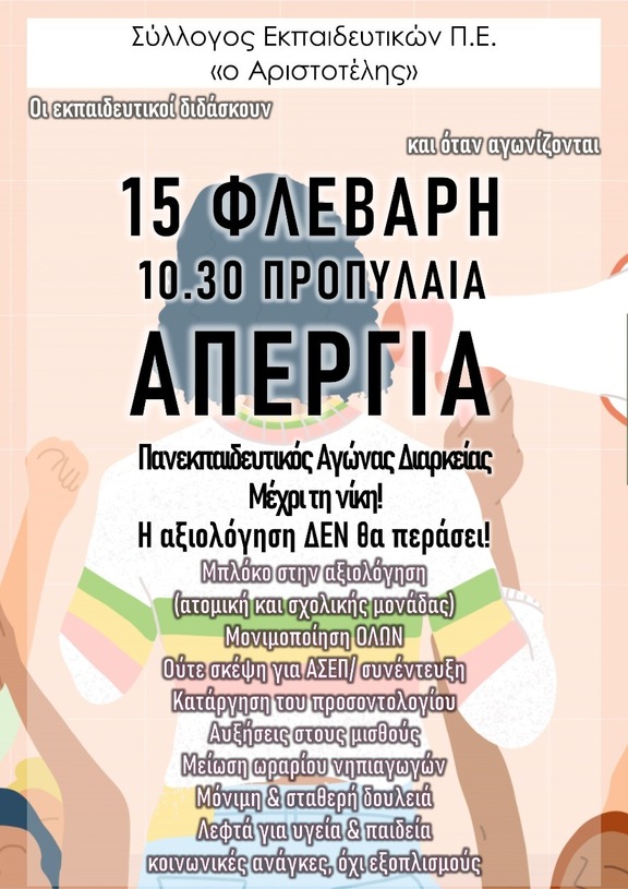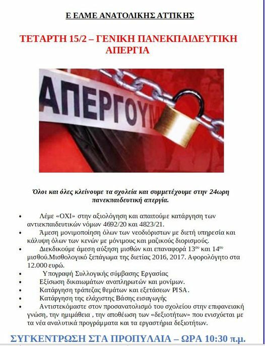ΚΑΛΕΣΜΑ ΣΤΗΡΙΞΗΣ ΤΗΣ ΑΠΕΡΓΙΑΣ ΤΩΝ ΕΚΠΑΙΔΕΥΤΙΚΩΝ ΣΤΙΣ 15/2 ΚΑΙ ΤΗΣ ΑΥΡΙΑΝΗΣ ΑΠΕΡΓΙΑΚΗΣ ΠΟΡΕΙΑΣ