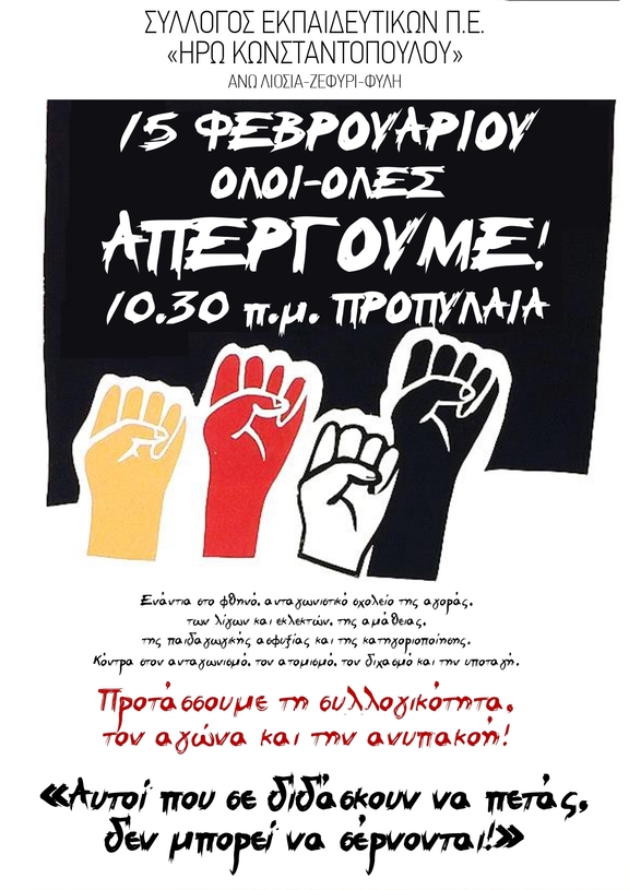 15 Φλεβάρη κλείνουμε τα σχολεία και βγαίνουμε ξανά στον δρόμο!Ενάντια στο σχολείο-εργοστάσιο της αξιολόγησης, στο επιλεκτικό φθηνό σχολείο των λίγων και εκλεκτών, της αμάθειας, της εξουθένωσης, του φόβου. Η εκπαίδευση είναι κοινωνικό δικαίωμα και όχι εμπόρευμα. Για την παιδαγωγική ελευθερία έναντι της υποταγής και της χειραγώγησης!