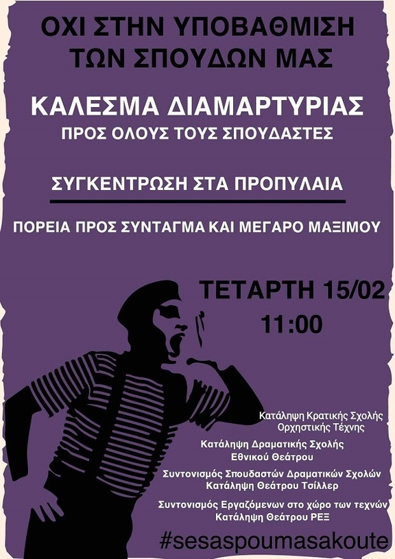 Η Κατάληψη της Δραματικής Σχολής του Εθνικού Θεάτρου καλεί σε κινητοποιήσεις την Τετάρτη 15.02 στις 11:00 στα Προπύλαια και στις 17.00 έξω από το Αρχαιολογικό Μουσείο μαθητές/τριες, σπουδαστές/στριες, διδάσκουσες/οντες, καλλιτέχνιδες/ες από όλο το φάσμα των τεχνών καθώς και εργαζόμενους/ες όχι μόνο στον πολιτισμό, αλλά σε όλα τα πεδία, προκειμένου να διαμαρτυρηθούμε πιο συλλογικά από ποτέ, ενάντια στο βαρύτατο πλήγμα που υφίστανται οι δημιουργοί εξαιτίας του ΠΔ85, της απουσίας κρατικής μέριμνας και της σκόπιμης υποβάθμισης των τεχνών στη χώρα μας.