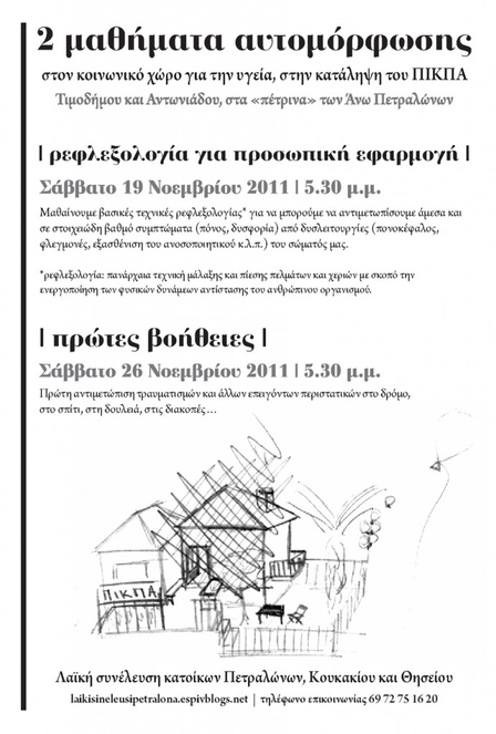 Το Σάββατο 19 Νοεμβρίου θα πραγματοποιηθεί στον κοινωνικό χώρο για την υγεία το πρώτο μάθημα αυτομόρφωσης πάνω στην ρεφλεξολογία. Θα μάθουμε βασικές τεχνικές για να μπορούμε να αντιμετωπίσουμε άμεσα και σε στοιχειώδη βαθμό συμπτώματα (πόνο, δυσφορία) από δυσλειτουργίες (πονοκέφαλος, φλεγμονές, εξασθένιση του ανοσοποιητικού κ.τ.λ.) του σώματός μας.
