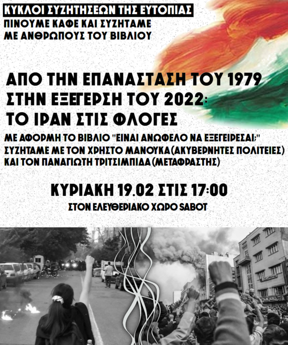 Με αφορμή το βιβλίο "είναι ανώφελο να εξεγείρεσαι" με κείμενα των Μισέλ Φουκώ και Μαξίμ Ροντενσόν συζητάμε με τον Χρήστο Μανούκα ,από τις Ακυβέρνητες Πολιτείες, και τον μεταφραστή του βιβλίου, Παναγιώτη Τσιτσιμπίδα, για τα χαρακτηριστικά, τις προοπτικές και τα αποτελέσματα των επαναστατικών και κινηματικών διεργασιών στο Ιράν τότε και τώρα, επιχειρώντας την σύνδεση με τους δικούς μας αγώνες στο σήμερα.