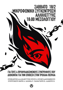 Οι σύντροφοι Φώτης Δ. και Ιάσονας Ρ. βρίσκονται προφυλακισμένοι εδώ και 15 μήνες, ενώ ένα χρόνο μετά τη σύλληψη τους, μπάτσοι έκαναν έφοδο στο σπίτι των συντρόφων Πάνου Β. και Λάμπρου Β. προφυλακίζοντας και κατηγορώντας τους για την ίδια υπόθεση. Ένα κατηγορητήριο στημένο και μια δικογραφία "κομμένη και ραμμένη" στα "θέλω" της κρατικής ασφάλειας, ποινικοποιώντας για άλλη μια φορά τις φιλικές και συντροφικές σχέσεις. Με την ημερομηνία της δίκης να παραμένει άγνωστη και το 18μηνο της προφυλάκισης σε λίγους μήνες να ολοκληρώνεται, καλούμε σε μικροφωνική-συγκέντρωση αλληλεγγύης το Σάββατο 18/2 στις 18:00 στον πεζόδρομο της Μεσολογγίου.