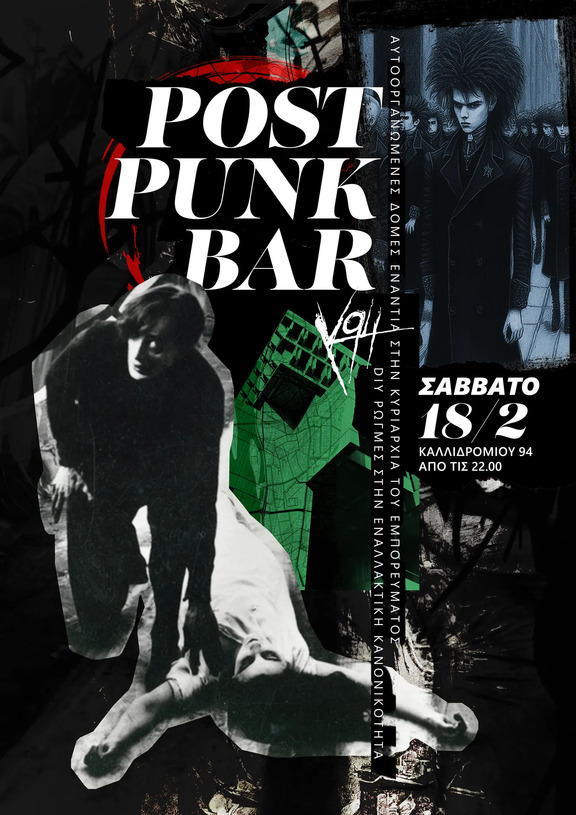 Το Σάββατο, στις 18 του Φλεβάρη, μαζευόμαστε στην Υπόγα από τις 22:00, για Post-Punk και κοντινές μουσικές. Ο χώρος μας λειτουργεί και θα λειτουργεί με βάση την ελεύθερη συνεισφορά και την αυτοοργάνωση, έναντια στους αποκλεισμούς και τις ιεραρχίες που δημιουργεί η κυριαρχία του εμπορεύματος.