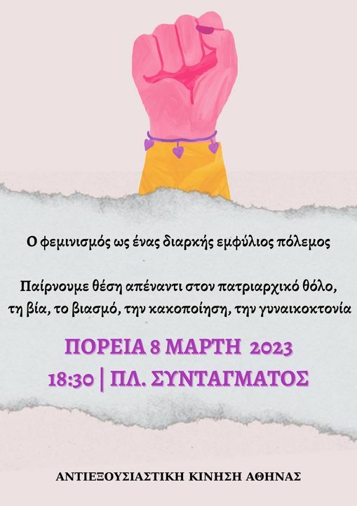 Παρα τις προσπαθειες κρατους και κεφαλαιου να αποπολιτηκοποιησουν και να εμπορευματοποιησουν τον συμβολισμο της 8η μαρτη ο οποιος εχει ξεκαθαρα αντιπατριαρχικα,αντιεξουσιαστικα και ταξικα χαρακτηριστικα, εμεις αντιλαμβανομαστε τον αγωνα εναντια στη πατριαρχια ως εναν αγωνα συνεχη και μαχητικο εξω απο τα ορια του θεσμικου φεμινισμου και της δημοκρατιας. Ετσι και αλλιως , η συγκεκριμενη μερα δεν ειναι γιορτη , αλλα ενα σημειο αναφορας ωστε να στεκομαστε συλλογικα και μαχητικα στο δρομο. Γι αυτο και εμεις στηριζουμε τις απεργιακες συγκεντρωσεις και την πορεια. ΕΝΑΝΤΙΑ ΣΕ ΚΑΡΤΟΣ,ΚΑΠΙΤΑΛΙΣΜΟ,ΠΑΤΡΙΑΡΧΙΑ