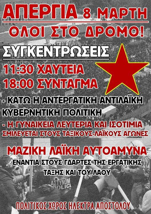 Συγκεντρώσεις: Τετάρτη 8 Μάρτη στις 11:30 - Χαυτεία και στις 18:00 - Σύνταγμα