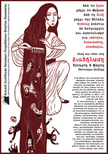 Η 8η Μάρτη, λοιπόν, δεν είναι γιορτή. Είναι μία ακόμη αφορμή να συνδεθούμε με το νήμα των φεμινιστικών αγώνων του παρελθόντος, γειώνοντας στο σήμερα τον πόλεμο ενάντια στην πατριαρχία και ενάντια σε κάθε εξουσία. Φέτος κατεβαίνουμε και πάλι στο δρόμο για να συνδέσουμε το δίκιο με την εξέγερση, με το βλέμμα πάντα στραμμένο στον επαναστατικό μετασχηματισμό των κοινωνικών σχέσεων.