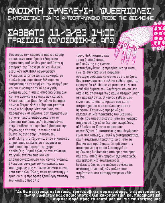 Ο συντονισμός για το αυτοοργωμένο pride της Θεσσαλονίκης «Queerιόλες» καλεί σε ανοιχτή συνέλευση το Σάββατο 11/2/23 στις 14:00 στα γρασίδια απέναντι από τη Φιλοσοφική του ΑΠΘ.