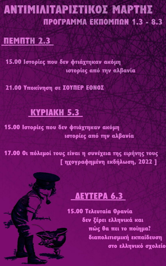 Αφιερώνουμε τον μήνα του Μάρτη στον αντιμιλιτατισμο, με θεματικές εκπομπές, μουσικά αφιερώματα και άλλες ραδιοφωνικές κασκαρικες ενάντια στη στράτευση, τους πολέμους, τους πατριώτες του κάθε έθνους και οποία μπότα μας πατάει στο λαιμό και μας κόβει την ανάσα.