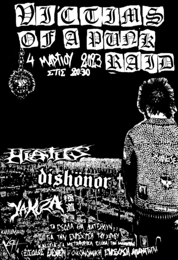 Victims of a Punk Raid…το Σάββατο στις 4 του Μάρτη, υποδεχόμαστε από…βόρεια τους Dishonor μαζί με τους Hiatus και τους Yakuza από Αθήνα, και στήνουμε συλλογικά αυτή την αυτοοργανωμένη συναυλία. Μαζευόμαστε από τις 20:30. Τα έσοδα θα διατεθούν για να καλύψουν τα μεταφορικά έξοδα των μπαντών αλλά και για την ενίσχυση του χώρου.