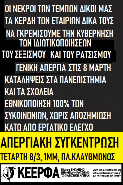 Όμως ακόμη περισσότερο χρειαζόμαστε πανεργατική απάντηση. Να βγει μαζικά στους δρόμους η οργή και ο θυμός που βράζει σε όλους τους εργατικούς χώρους. Απαιτούμε από τη ΓΣΕΕ και την ΑΔΕΔΥ, από τις ομοσπονδίες και τα Εργατικά Κέντρα να μετατρέψουν την φετινή 8 Μάρτη που είναι ήδη προκηρυγμένη απεργιακή κινητοποίηση σε πανελλαδική πανεργατική απεργία.