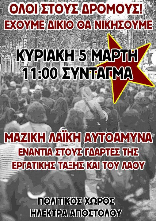 Καλούμε την εργατική τάξη, τον λαό και την νεολαία να συναντηθούμε μαζικά-οργανωμένα και δυναμικά την Κυριακή 5 Μάρτη στις 11:00 στο Σύνταγμα.