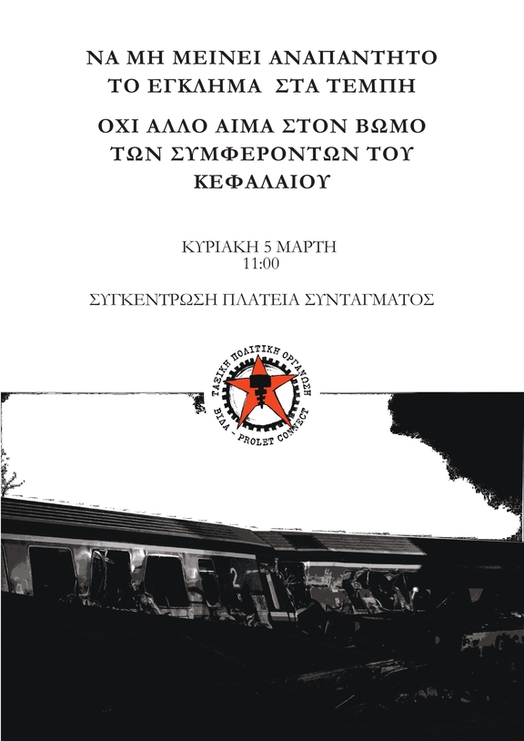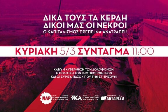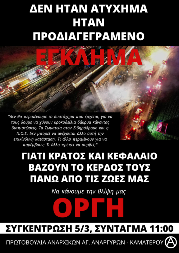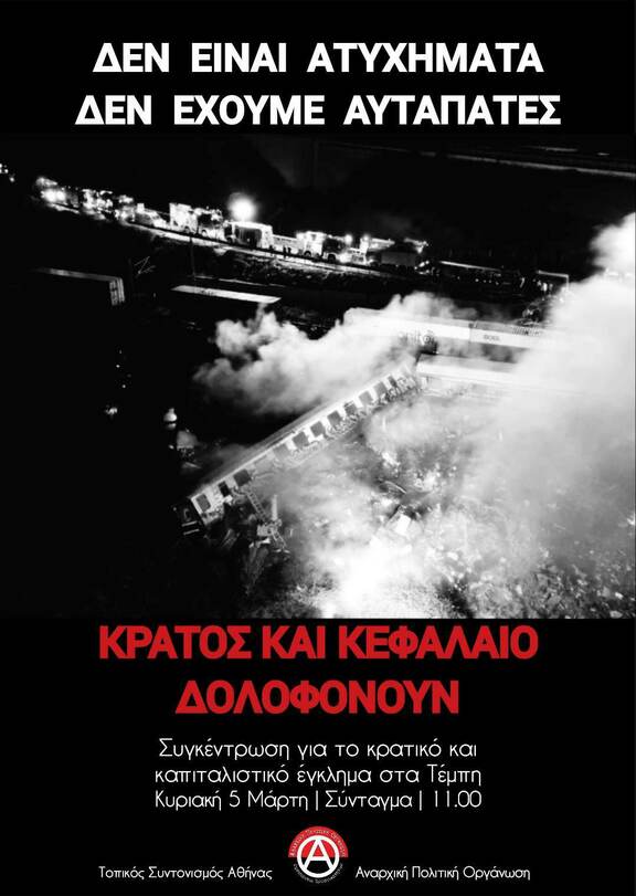Διαδήλωση - Κυριακή 5/3 - 11:00 Σύνταγμα - Οργή για το καπιταλιστικό έγκλημα στα Τέμπη. Πόλεμο στον πόλεμο κράτους και κεφαλαίου