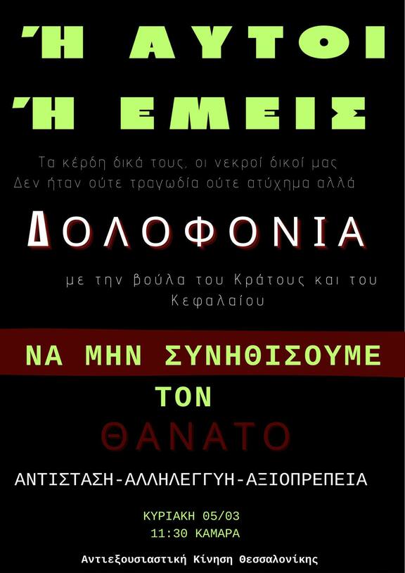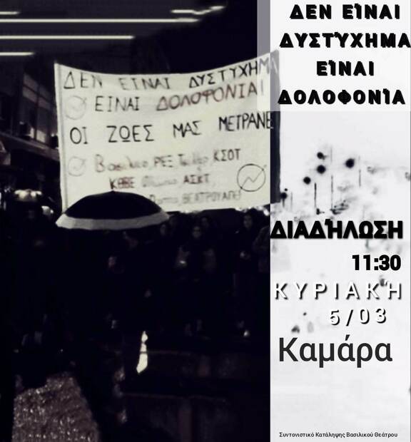 Συγκέντρωση-πορεία για την κρατική-καπιταλιστική δολοφονία στα Τέμπη