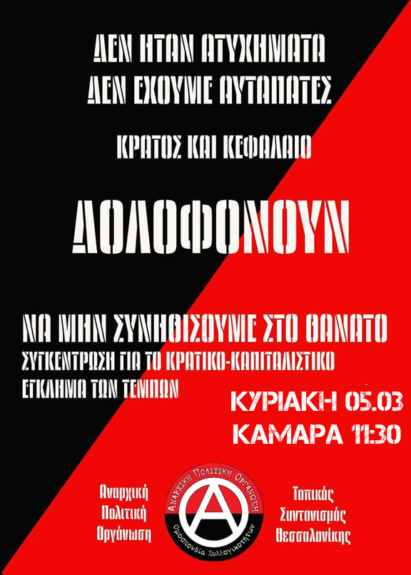 Αύριο Κυριακή 5/3 στις 11.30 στην Καμάρα, στηρίζουμε την απεργιακή διαδήλωση ενάντια στο κρατικό-καπιταλιστικο έγκλημα στα Τέμπη, όπου καλούν το ΣΕΠ ΤΡΕΝΟΣΕ και η Πανελλήνια Ένωση Προσωπικού Έλξης.