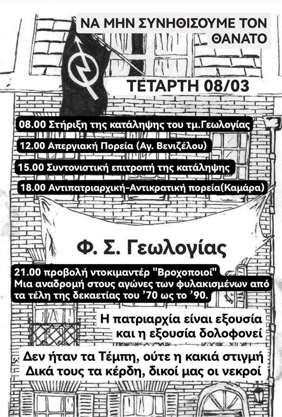 Την Τετάρτη είναι και η 8η Μάρτη, ημέρα αντίστασης και αγώνα ενάντια στην έμφυλη βία που ειναι θεσμική-συστημικη. Στον κόσμο της εξουσίας και της πατριαρχίας οι παρενοχλήσεις, οι ξυλοδαρμοί και οι βιασμοί, οι γυναικοκτονίες, οι επιχειρησεις του τράφικινγκ, οι παιδεραστές, βασανιστές και μπάτσοι δολοφόνοι είναι η καθημερινότητα.