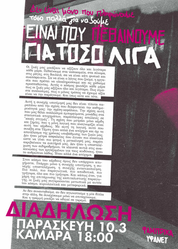 Η εξαθλίωση που βιώνουμε στο πετσί μας εντονότερα πάνω από μια δεκαετία τώρα και θα συνεχίσουμε να την βιώνουμε, σε μια χώρα, όπου παρακολουθούμε το μεγαλύτερο τσιμπούσι επενδυτών και επιχειρηματικών ομίλων, την καταστροφή του δημόσιου και των κοινών αγαθών, είναι αβάσταχτη και πρέπει να την φρενάρουμε. Η υγεία, η παιδεία, η πρώτη κατοικία, οι μετακινήσεις, το νερό και το ρεύμα είναι βασικοί πυλώνες στη ζωή μας και όχι προς διάθεση για κερδοφορία του κεφαλαίου, ιδιωτικού και μη. Ας πάρουμε τις ζωές μας στα χέρια μας. Για να μην θρηνούμε άλλα θύματα από την αναλγησία κράτους και κεφαλαίου, να διεκδικήσουμε τον έλεγχο όλων των πτυχών της ζωής μας μέσα από συλλογικές και αμεσοδημοκρατικές διαδικασίες. Για να ζήσουμε μια ζωή σαν άνθρωποι ελεύθεροι.