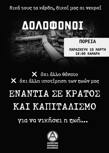 Με το ξεπούλημα της ΤΡΑΙΝΟΣΕ στους Ιταλούς επενδυτές και την ταυτόχρονη επαναφορά τραίνων που είχαν αποσυρθεί στην Ελβετία, ακολούθησαν οι κυβερνητικοί διθύραμβοι σχετικά με την αναβάθμιση των σιδηροδρομικών μέσων. Αυτή είναι λοιπόν η αναβάθμιση στην ιδιωτικοποίηση: Να παίζεται η ζωή των ανθρώπων που μετακινούνται και των εργαζομένων κορώνα γράμματα, αφού δεν πρόκειται να δοθούν χρήματα για τον έλεγχο, την πρόληψη και την ασφάλεια των ανθρώπων. Όταν λοιπόν οι ζωές μας λογίζονται ως ένα ακόμα έξοδο στον προϋπολογισμό του κράτους και του κεφαλαίου μιλάμε για προδιαγεγραμμένες δολοφονίες - ούτε για ατυχήματα, ούτε για ''ανθρώπινα λάθη'', ούτε για ''κακή στιγμή''. Οι εγκληματίες του υπουργείου μεταφορών, της διοίκησης της Hellenic Train και όλου του κρατικού μηχανισμού που συνέβαλλαν σε αυτή τη δολοφονία θα λογαριαστούν με όλη την κοινωνική βάση, το οργανωμένο κίνημα και τις αντιστάσεις του. Το υποκριτικό πένθος που κηρύχθηκε από την κυβέρνηση μόνο οργή μας προκαλεί. Οι αγώνες μας για δημόσια και αξιοπρεπή συγκοινωνιακά μέσα, οι αγώνες μας ενάντια στο κράτος και τον καπιταλισμό κουβαλάνε τη δικαιοσύνη που αποζητάμε.