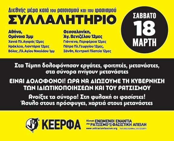 Καλούμε τα συνδικάτα και τους φοιτητικούς συλλόγους, τις κοινότητες μεταναστών και τους πρόσφυγες από τα καμπ να ενωθούμε σε μια γροθιά και να στηρίξουμε την κλιμάκωση του απεργιακού αγώνα και των συλλαλητηρίων για να διώξουμε την κυβέρνηση των δολοφόνων, των ιδιωτικοποιήσεων, του σεξισμού και του ρατσισμού. Να στηρίξουμε το συλλαλητήριο στις 18 Μάρτη, να μην αφήσουμε τη ΝΔ να μετατρέπει τους πρόσφυγες σε αποδιοπομπαίους τράγους για τα εγκλήματα της.