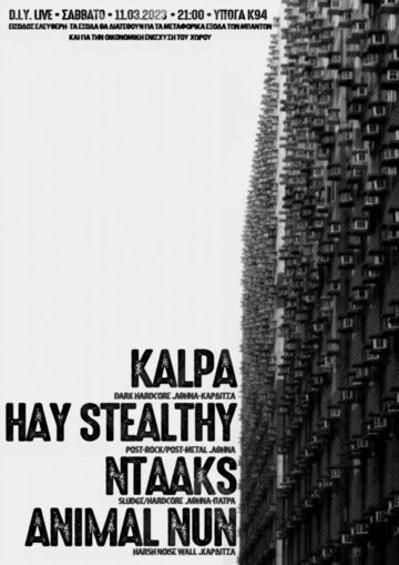 Ολοένα και συχνότερα, ακόμα κι εντός των D.I.Y. σκηνών, βλέπουμε να παρεισφύουν οι λογικές του εμπορεύματος, γεννώντας διαχωρισμούς σε "μπάντες και είδη που τραβάνε τον κόσμο" και το αντίθετο. Ως Υπόγα, θέλουμε να συνδιοργανώνουμε με άτομα που συγγενεύουμε ιδεολογικά, διαλύοντας έμπρακτα αυτούς του διαχωρισμούς. Ένα τέτοιο live είναι κι αυτό που στήνουμε το Σάββατο, μαζί με τους Kalpa, Hay Stealthy, Ntaaks και Animal Nun.