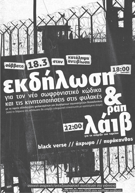 Εκδήλωση για τον νέο σωφρονιστικό κώδικα και τις κινητοποιήσεις στις φυλακές με το ταμείο αλληλεγγύης φυλακισμένων και διωκόμενων αγωνιστ(ρι)ών Θεσσαλονίκης. Κατά τη διάρκεια της εκδήλωσης θα υπάρξει τηλεφωνική επικοινωνία με κρατούμενα άτομα.