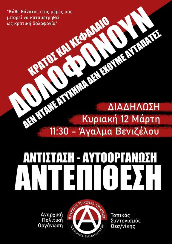 Κάθε μέρα, σε κάθε πτυχή και έκφανση της κοινωνικής οργάνωσης και της καθημερινής ζωής, γίνεται προφανές ότι το κράτος και το κεφάλαιο δολοφονούν, τρομοκρατούν και καταστέλλουν! Από τη διαχείριση την πανδημίας και της υγειονομικής κρίσης, τις φωτιές στην Εύβοια, τη διαχείριση των μεταναστευτικών πληθυσμών, με τις δολοφονίες και τα push-backs στα σύνορα, μέχρι τη βίαιη καταστολή των διαδηλώσεων, τους ξυλοδαρμούς φοιτητών, τους βιασμούς, τα κυκλώματα trafficking, τις δολοφονίες εργατών που ολοένα πολλαπλασιάζονται, είναι πλέον έκδηλο ότι οι ζωές των καταπιεσμένων είναι αναλώσιμες, δίχως αξία. Και είναι παράλληλα πολύ σημαντικό επίδικο η γιγάντωση των κινητοποιήσεων ενάντια στην θανατοπολιτικη κράτους και κεφαλαίου. Από τους χώρους εργασίας και τις γειτονιές, ως τις δραματικές σχολές, τα πανεπιστήμια και τα σχολεία, να βρεθούμε σε ανοιχτές αδιαμεσολάβητες διαδικασίες, σε καταλήψεις κέντρα αγώνα, μακριά από εκλογικές υποσχέσεις και αυταπάτες. Να βρεθούμε ξανά και ξανά, αυτοοργανωμένα, συλλογικά και μαχητικά στον δρόμο, ώστε να γίνει ξεκάθαρο πως οι κρατικές και καπιταλιστικές δολοφονίες δεν θα ξεχαστούν, ενώ ταυτόχρονα θα συμβάλλουμε στο γκρέμισμα του κράτους και του καπιταλισμού, για έναν κόσμο ισότητας, ελευθερίας, αλληλεγγύης. Για την αναρχία, και τον ελευθεριακό κομμουνισμό.