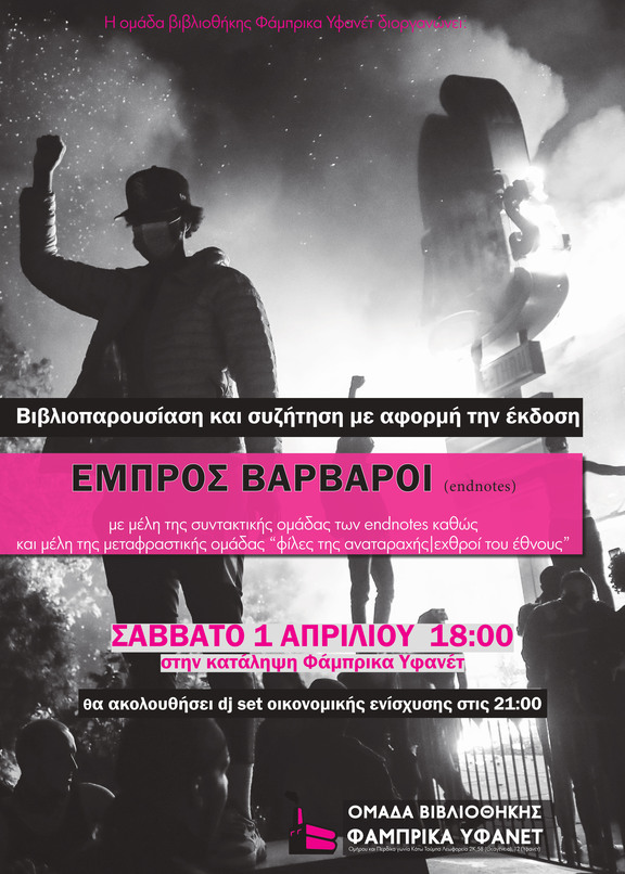 Η ομάδα βιβλιοθήκης Φάμπρικα Υφανέτ διοργανώνει το Σάββατο 1 Απριλίου βιβλιοπαρουσίαση και συζήτηση της έκδοσης "Εμπρός Βάρβαροι" με μέλη της συντακτικής ομάδας των Endnotes καθώς και με μέλη της μεταφραστικής ομάδας "Φίλες της αναταραχής /εχθροί του έθνους"