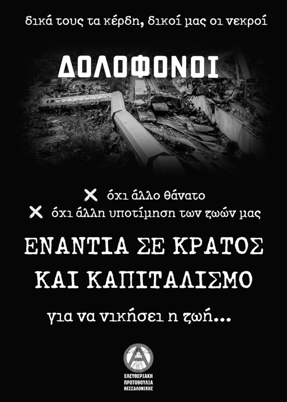 Με το ξεπούλημα της ΤΡΑΙΝΟΣΕ στους Ιταλούς επενδυτές και την ταυτόχρονη επαναφορά τραίνων που είχαν αποσυρθεί στην Ελβετία, ακολούθησαν οι κυβερνητικοί διθύραμβοι σχετικά με την αναβάθμιση των σιδηροδρομικών μέσων. Αυτή είναι λοιπόν η αναβάθμιση στην ιδιωτικοποίηση: Να παίζεται η ζωή των ανθρώπων που μετακινούνται και των εργαζομένων κορώνα γράμματα, αφού δεν πρόκειται να δοθούν χρήματα για τον έλεγχο, την πρόληψη και την ασφάλεια των ανθρώπων. Όταν λοιπόν οι ζωές μας λογίζονται ως ένα ακόμα έξοδο στον προϋπολογισμό του κράτους και του κεφαλαίου μιλάμε για προδιαγεγραμμένες δολοφονίες - ούτε για ατυχήματα, ούτε για «ανθρώπινα λάθη», ούτε για «κακή στιγμή». Οι εγκληματίες του υπουργείου μεταφορών, της διοίκησης της Hellenic Train και όλου του κρατικού μηχανισμού που συνέβαλλαν σε αυτή τη δολοφονία θα λογαριαστούν με όλη την κοινωνική βάση, το οργανωμένο κίνημα και τις αντιστάσεις του. Το υποκριτικό πένθος που κηρύχθηκε τις πρώτες μέρες από την κυβέρνηση, η παραίτηση του «αρμόδιου» υπουργού, η «συγνώμη» του πρωθυπουργού και η γενικότερη προσπάθεια επικοινωνιακής διαχείρισης της τραγωδίας αυτής με σκοπό την μετατόπιση των ευθυνών κράτους και αφεντικών στον ανθρώπινο παράγοντα, μόνο οργή μας προκαλεί. Οι αγώνες μας για δημόσια και αξιοπρεπή συγκοινωνιακά μέσα, οι αγώνες μας ενάντια στο κράτος και τον καπιταλισμό κουβαλάνε τη δικαιοσύνη που αποζητάμε.