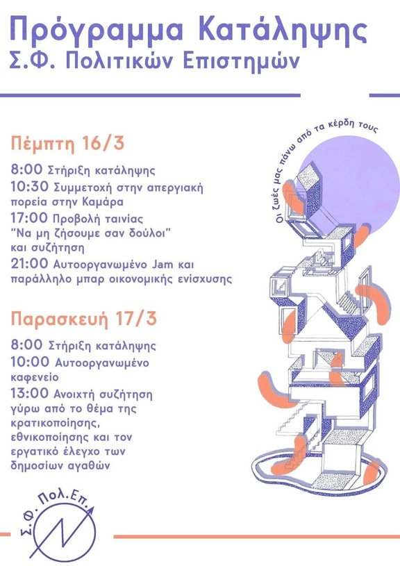 Μέσα σε αυτή τη συνθήκη το πρωί της Δευτέρας 13/3 πραγματοποιήθηκε στην Αθήνα από την «Κίνηση Φοιτητών/τριών Σπουδαστριών/ων για την ελευθεριακή οργάνωση στην βάση» κατάληψη της Πρυτανείας του ΕΚΠΑ ενάντια στην υποβάθμιση των ζωών μας, με αιχμές το κρατικό - καπιταλιστικό έγκλημα στα Τέμπη αλλά και το ΠΔ.85 σε βάρος των καλλιτεχνών, ως κομμάτι της γενικής αναδιάρθρωσης της εκπαίδευσης. Το κράτος και η νεοφιλελεύθερη κυβέρνηση της ΝΔ, επέλεξαν για άλλη μία φορά να τρομοκρατήσουν -μάταια μεν- τους αγωνιστές με το να παρατάξουν τα ΜΑΤ αποκλείοντας την πρόσβαση στην κατειλημμένη πρυτανεία και προχωρώντας μέχρι και σε προσαγωγές αλληλέγγυων εκτός του κτιρίου. Αποτελεί λοιπόν πολύ σημαντικό ζητούμενο αυτής της περιόδου τόσο η γιγάντωση των κινητοποιήσεων ενάντια στην θανατοπολιτική κράτους και κεφαλαίου όσο και η συνολικοποίηση των αντιστάσεων και των επιμέρους αγώνων που δίνονται.
