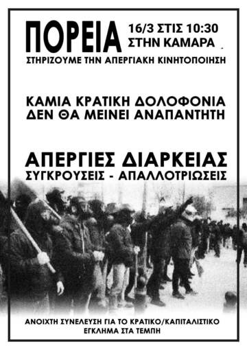Κάλεσμα στην Γενική Απεργία, 16/3 10:30 στη Καμάρα, ενάντια στο κρατικό-καπιταλιστικό έγκλημα στα Τέμπη.