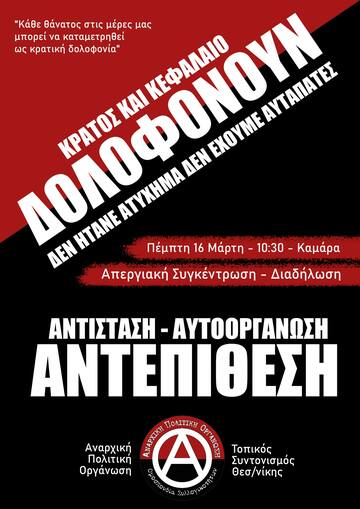 Από τους χώρους εργασίας και τις γειτονιές, ως τις δραματικές σχολές, τα πανεπιστήμια και τα σχολεία, να βρεθούμε σε ανοιχτές και από τα κάτω διαδικασίες, σε καταλήψεις και κέντρα αγώνα, μακριά από εκλογικές υποσχέσεις και αυταπάτες οι οποίες έχουν μόνο σκοπό να εκτονώσουν τους αγώνες μας και να τους διοχετεύσουν σε βολικές για το σύστημα επιλογές διαχείρισης και αφομοίωσης. Να βρεθούμε ξανά και ξανά, αυτοοργανωμένα, συλλογικά και μαχητικά στον δρόμο, ώστε να γίνει ξεκάθαρο πως οι κρατικές και καπιταλιστικές δολοφονίες δεν θα ξεχαστούν, πως η τρομοκρατία των αφεντικών και η κρατική καταστολή δεν περνάνε, ενώ ταυτόχρονα να συμβάλλουμε στην οργάνωση των καταπιεσμένων με ελευθεριακά σχήματα και σωματεία βάσης, να πυκνώσουμε τις κοινωνικές και ταξικές αντιστάσεις με σκοπό το γκρέμισμα του παρηκμασμένου κόσμου του κράτους και του καπιταλισμού. Να οικοδομήσουμε έναν νέο κόσμο δίχως καταπιεστές και καταπιεσμένους, μία κοινωνία ισότητας, ελευθερίας και αλληλεγγύης. Για την αναρχία, και τον ελευθεριακό κομμουνισμό.