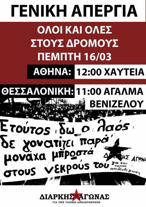 ΣΥΝΕΧΙΖΟΥΜΕ - Aγώνας Διαρκείας παντού - Πέμπτη 16/3: όλοι στην απεργία, όλοι στους δρόμους (Αφίσα & Βίντεο)