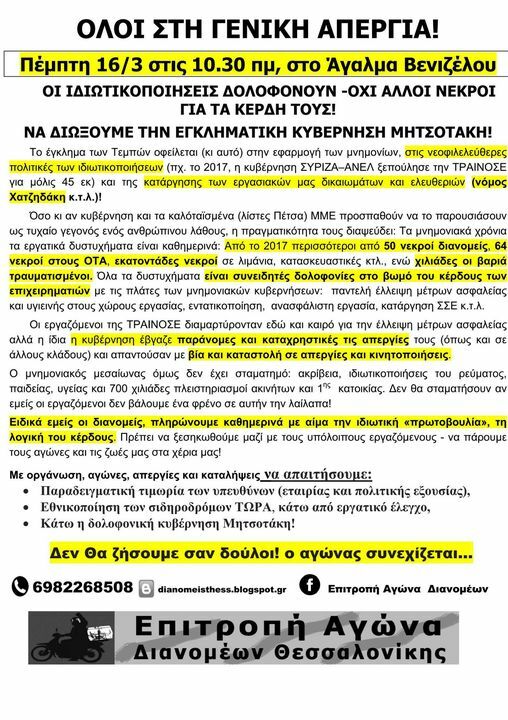 Η τραγωδία στα Τέμπη μόνο απεριόριστη οργή και θλίψη μας έχει προκαλέσει! Δεν έχουν περάσει 3 εβδομάδες που η κυβέρνηση και οι εργοδότες στον κλάδο, μας ξεκαθάρισαν με τον πιο ωμό τρόπο (με ξύλο και χημικά από τα ΜΑΤ) ότι: ακόμη και οι ανεφάρμοστες Συλλογικές Συμβάσεις στον κλάδο -τέλος! και αν θέλουμε δουλειά, αυτή θα είναι ΜΕ ΑΣΙΑΤΙΚΟΥΣ ΜΙΣΘΟΥΣ, χωρίς δικαιώματα. Αν θέλουμε δουλειά οι διανομείς αυτή θα είναι με το κομμάτι, με το μεσαιωνικό εργασιακό καθεστώς του freelancing. Οι συνάδελφοι στη σεζόν θα δουλεύουμε ήλιο με ήλιο για ένα ξεροκόμματο και όλοι μαζί θα μετράμε τους νεκρούς από τα εργατικά δυστυχήματα/ δολοφονίες κυβέρνησης και εργοδοτών. Θα δουλεύουμε ανασφάλιστοι ή υποασφαλισμένοι, χωρίς εισόδημα και προστασία στην ανεργία, χωρίς κανένα δικαίωμα, «χειροκροτώντας» και υπομένοντας την ψευδεπίγραφη «ανάπτυξη» του Μητσοτάκη και τα κέρδη των εργοδοτών στον κλάδο. Ως ΕΔΩ! Να τους στείλουμε στον αγύριστο.