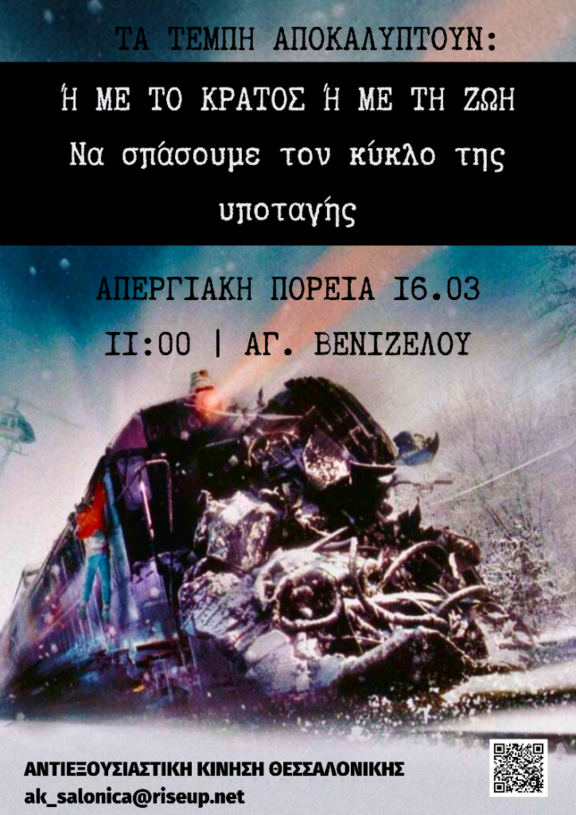 Αυτή τη φορά, όλοι μαζί να πάμε μέχρι τέλους. Η οργή να μην ξεθυμάνει σ' ένα προεκλογικό θέατρο. Όχι και στην «υπεύθυνη» απάτη του ΣΥΡΙΖΑ: χθες ιδιωτικοποιούσε, τώρα μιλάει για «δικαιοσύνη» μέσα απ' τους ίδιους σάπιους θεσμούς (βουλή, «ανεξάρτητες» αρχές). Να μην αφήσουμε διάσπαρτες τις κινητοποιήσεις. Να τις ενώσουμε και κλιμακώσουμε. Με Διαδηλώσεις, Καταλήψεις, Γενική Πολιτική Απεργία. Να οργανώσουμε τον αγώνα, να συντονιστούμε με επιτροπές δράσης σε χώρους δουλειάς, σχολές, σχολεία, γειτονιές. Απαιτούμε: Τιμωρία των ενόχων. Εθνικοποίηση των σιδηροδρόμων ΤΩΡΑ, κάτω από εργατικό έλεγχο, χωρίς αποζημίωση του ιδιώτη - και όλων των δημόσιων δομών/αγαθών που ξεπουλήθηκαν. Κάτω η κυβέρνηση Μητσοτάκη - με τους εργαζόμενους και τη νεολαία στους δρόμους, όποια κυβέρνηση κι αν μαγειρευτεί στις επόμενες εκλογές, θα έχει τον φόβο μας!