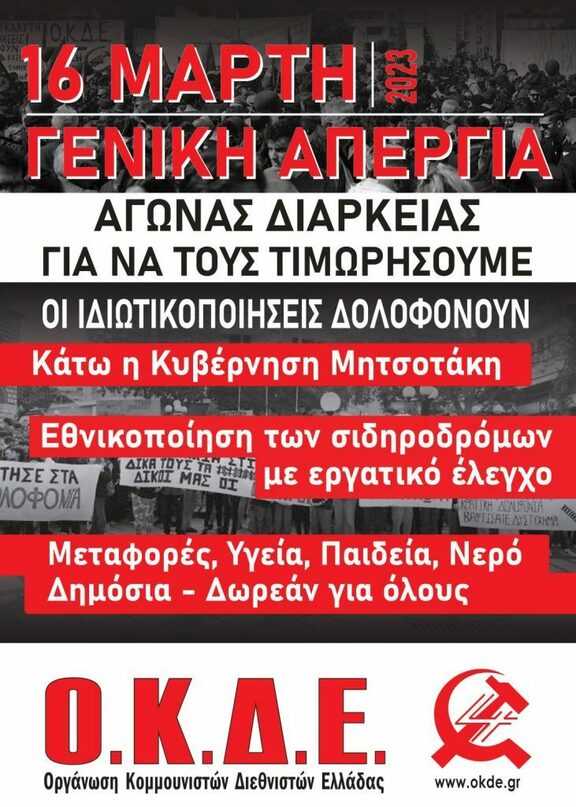 Στα Τέμπη δεν έγινε δυστύχημα, αλλά ΕΓΚΛΗΜΑ, θυσία στο βωμό του κέρδους. Κυβέρνηση και πετσοταϊσμένα ΜΜΕ προσπάθησαν να μας πουν για «ανθρώπινο λάθος» και «χρόνιες παθογένειες του κράτους», αλλά η αλήθεια δεν κρύβεται. Αιτία είναι τα Μνημόνια, οι νεοφιλελεύθερες πολιτικές των ιδιωτικοποιήσεων. Απανωτές είναι οι αποκαλύψεις των εργαζομένων για την κατάσταση σε όλες τις συγκοινωνίες.