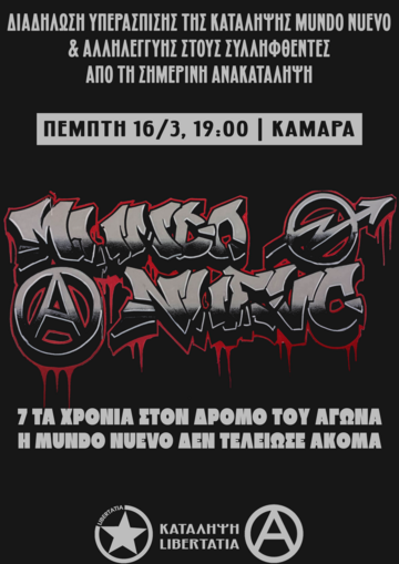 Καλούμε σε διαδήλωση υπεράσπισης της Mundo Nuevo και αλληλεγγύης στους συλληφθέντες σήμερα, 16 Μαρτίου στις 19:00 στην Καμάρα.
