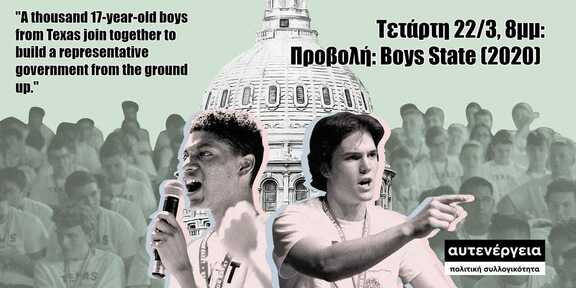 Με αφορμή τις ερχόμενες εκλογές και την καμπάνια μας ενάντια στην λογική της ανάθεσης, η κινηματογραφική ομάδα της Αυτενεργειας διοργανώνει προβολή του ντοκιμαντέρ Boys State στον κοινωνικό χώρο του Τρισέ (Κολοκοτρώνη 31, Σύνταγμα) την Τετάρτη 22 Μαρτίου στις 8μμ!