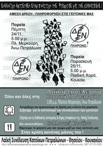 Για το μεσημέρι της Κυριακής 27 Νοέμβρη, στην πλατεία Μερκούρη των Άνω Πετραλώνων, είναι προγραμματισμένη η επόμενη συνέλευση κατοίκων των γειτονιών μας. Συζητάμε για τις διαδικασίες λειτουργίας και λήψης αποφάσεων της συνέλευσης και διερευνούμε τις δυνατότητες συντονισμού με συνελεύσεις κατοίκων από άλλες γειτονιές.