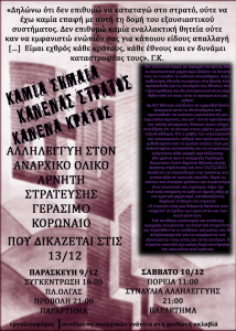 Αλληλεγγύη στον ολικό αρνητή στράτευσης Γεράσιμο Κορωναίο που δικάζεται στις 13/12