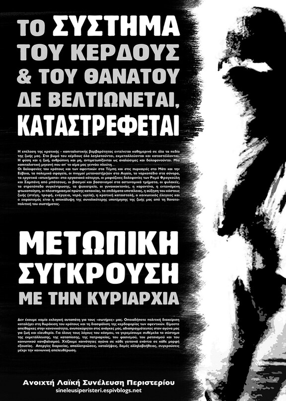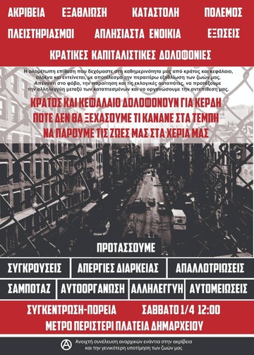Να εμπνευστούμε από τα παραδείγματα κοινωνικής-ταξικής αλληλεγγύης και αγώνα, όπως οι απεργίες στην Μαλαματίνα και την COSCO, οι κινητοποιήσεις των ντελιβεράδων ενάντια στις ελαστικές σχέσεις εργασίας, οι απαλλοτριώσεις ειδών πρώτης ανάγκης σε σούπερ μάρκετ, οι μαζικές πορείες στήριξης ενάντια σε εξώσεις σπιτιών, οι ενέργειες άμεσης δράσης ενάντια στις δυνάμεις καταστολής, γραφεία πολιτικών, επιχειρήσεις αφεντικών και λοιπών κρατικών και καπιταλιστικών στόχων. Προτάσσουμε την πολυμορφία του αγώνα, την εξεγερσιακή πρακτική και την επαναστατική προοπτική για την καταστροφή κράτους και κεφαλαίου. Για ένα κόσμο ελευθερίας, ισότητας και αλληλεγγύης, χωρίς καταπίεση και εκμετάλλευση.