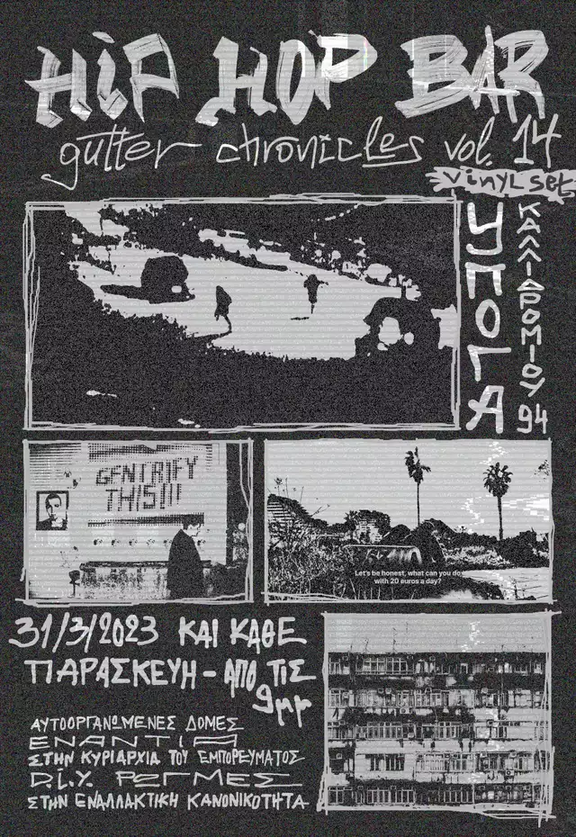 Χιπχοπ μπαρ απ' την αυτοοργανωμένη σκηνή για την αυτοοργανωμένη σκηνή, με ελεύθερη συνεισφορά, ενάντια στην εμπορευματοποίηση της στήριξης.