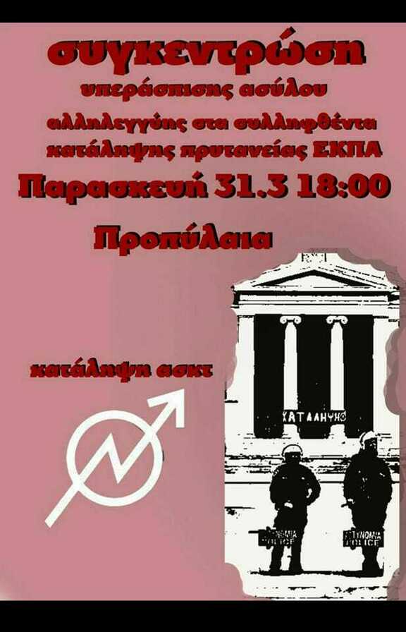 Καλούμε την Παρασκευή 31/3 στις 18:00 στα Προπύλαια σε συγκέντρωση αλληλεγγύης για τα συλληφθέντα της Κατάληψης Πρυτανείας ΕΚΠΑ.