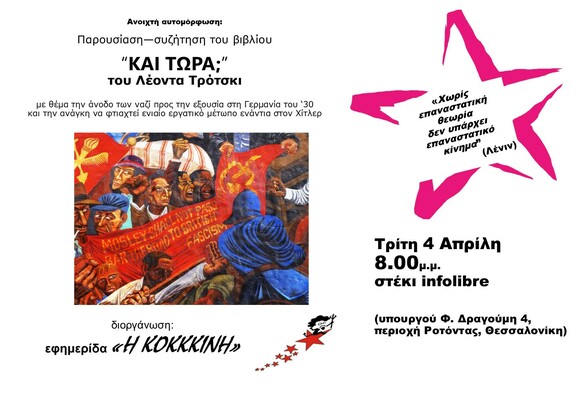 Ανοιχτή αυτομόρφωση της εφημερίδας "Η ΚΟΚΚΙΝΗ" για μια πρώτη γνωριμία με το έργο του Λέοντα Τρότσκι την Τρίτη 4 Απρίλη 2023 στις 8μμ, στο στέκι infolibre (υπουργού Φ. Δραγούμη 4, περιοχή Ροτόντας, Θεσσαλονίκη).
