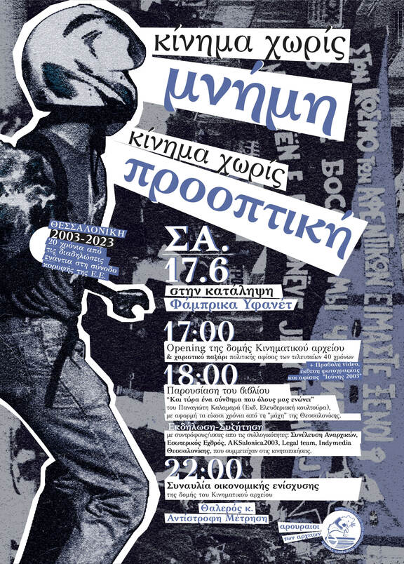17:00 - Opening της δομής Κινηματικού αρχείου & χαριστικό παζάρι πολιτικής αφίσας των τελευταίων 40 χρόνων + Προβολή video, έκθεση φωτογραφίας και αφίσας "Ιούνης 2003"
