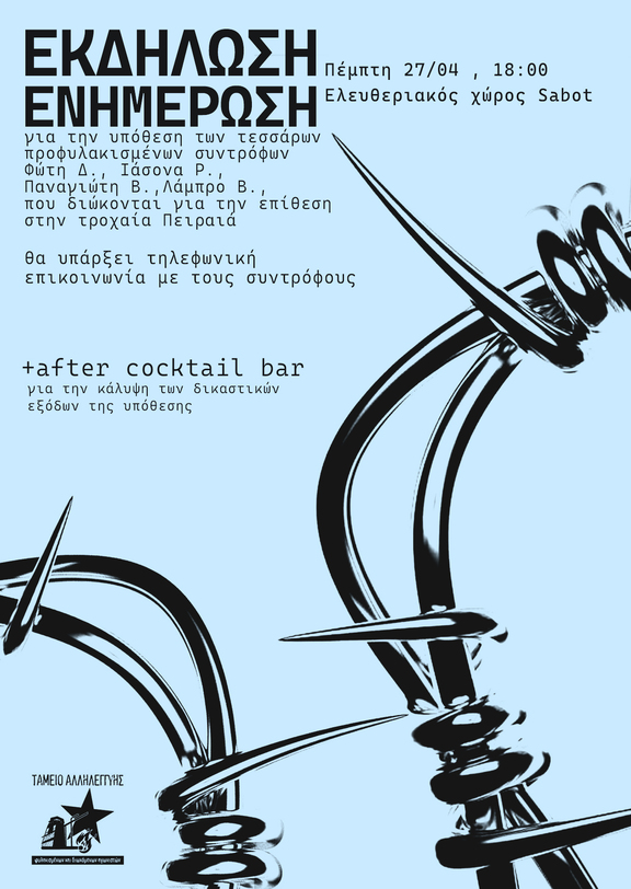 Οι 4 αγωνιστές κατηγορούνται με βάση ένα σαθρό κατηγορητήριο για την επίθεση στην Τροχαία Πειραιά στις 14/11/21 και με βαρύτατες κατηγορίες καθώς θα δικαστουν σύμφωνα με τον νέο ποινικό κώδικα. Η δίκη ορίστηκε για τις 8/5 στην δικαστική αίθουσα Κορυδαλλού. Εν όψει της δίκης των 4ων προφυλακισμένων συντρόφων θα γίνει εκδήλωση-ενημέρωση για την υπόθεση τους και συζήτηση πάνω σε αυτήν.