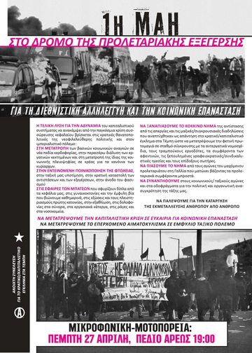 Στη σημερινή συγκυρία, ο καπιταλιστικός-ιμπεριαλιστικός πόλεμος, ο πληθωρισμός και οι αντιπληθωριστικές πολιτικές αποτελούν όπλα για τη μετατόπιση του βάρους και του κόστους της παγκόσμιας καπιταλιστικής κρίσης στις πλάτες της παγκόσμιας εργατικής τάξης, ώστε στη συνέχεια να ξεκινήσει μια νέα ανοδική πορεία της καπιταλιστικής συσσώρευσης χτισμένη πάνω στην εξαθλίωση και τη θανάτωση εκατομμυρίων ανθρώπων. Η φετινή Πρωτομαγιά θα πρέπει σε αυτή τη βάση να ξαναγίνει μέρα επιβεβαίωσης της διεθνούς ταξικής αλληλεγγύης, θα πρέπει να γίνει μέρα αποφασιστικής δράσης και αγώνα του παγκόσμιου προλεταριάτου ενάντια στους καταπιεστές και τους εκμεταλλευτές μας: ΕΝΑΝΤΙΑ στην κρυμμένη καθημερινή απονέκρωση της ζωής που επιφέρει η «κανονική» εκμετάλλευση και η αλλοτρίωση της μισθωτής εργασίας· ΕΝΑΝΤΙΑ στις καθημερινές δολοφονίες στους πολέμους, στις διασχίσεις των συνόρων, στις ασθένειες και στα «δυστυχήματα» που δεν μπορούν πια να κρυφτούν· ΕΝΑΝΤΙΑ στο σύστημα της μισθωτής εργασίας και στην εκμετάλλευση ανθρώπου από άνθρωπο.