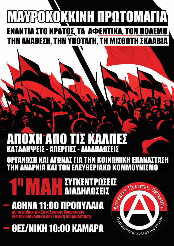 Η στήριξη και η συμμετοχή στις φετινές απεργιακές διαδηλώσεις της Εργατικής Πρωτομαγιάς είναι κομβικής σημασίας για τους αγώνες της εργατικής τάξης. Οφείλουμε να δώσουμε ένα ηχηρό μήνυμα αντίστασης απέναντι στο κράτος και το κεφάλαιο, απέναντι στα αφεντικά και το πολιτικό τους προσωπικό, που υλοποιούν την καθημερινή καταπίεση, εκμετάλλευση και εξαθλίωση που βιώνουμε. Βασιζόμενοι/Βασιζόμενες στην αυτοοργάνωση, την ταξική αλληλεγγύη και την πίστη στην απελευθερωτική υπόθεση της κοινωνικής επανάστασης να έρθουμε σε ρήξη με τα αστικά κόμματα και τον αστικοποιημένο/γραφειοκρατικό συνδικαλισμό, που αποτελούν ταφόπλακα για τους αγώνες μας. Επιτακτικό καθήκον της εποχής μας είναι η συγκρότηση ενός ακηδεμόνευτου, ταξικού, αντιπολεμικού, διεθνιστικού, Επαναστατικού Κινήματος που θα μπορέσει αφενός να πετύχει σημαντικές νίκες, μερικού χαρακτήρα, στην κατεύθυνση της ικανοποίησης των εργατικών συμφερόντων και των κοινωνικών αναγκών, αφετέρου να θέσει τους κατάλληλους όρους σύγκρουσης και επαναστατικής ανατροπής του κράτους και του κεφαλαίου, για τη συλλογική οικοδόμηση της κοινωνίας του ελευθεριακού κομμουνισμού.