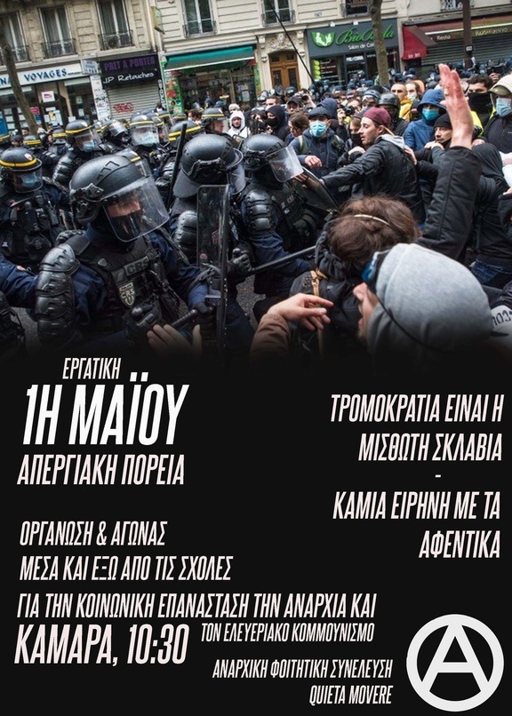 "Στις εξεγέρσεις του χθες θα στήνονται μνημεία, στις εξεγέρσεις του σήμερα πολυβόλα" είναι ένα σύνθημα που αποτυπώνει άρρηκτα την αλήθεια σχετικά με τη στάση των εξουσιαστών μας με την Πρωτομαγιά. Μπορεί η μέρα της Πρωτομαγιάς να έχει καθιερωθεί ημέρα αργίας από το κράτος αλλά η πραγματικότητα είναι εντελώς διαφορετική όταν σε παγκόσμια κλίμακα κατακτήσεις αιώνων καταπατώνται ανηλεώς. Στην Ελλάδα συγκεκριμένα, νόμοι όπως ο νόμος Χατζηδάκη, η καταπατήσεις των συλλογικών συμβάσεων εργασίας, τα μισά ή τα καθόλου ένσημα, οι αδήλωτες υπερωρίες, οι απλήρωτοι μισθοί, η ακρίβεια, οι απλήρωτες συντάξεις, οι συνεχόμενες απεργοσπασίες, τα εργασιακά κάτεργα της καλοκαιρινής σεζόν, οι παραβιαστικές συμπεριφορές στους χώρους εργασίας, τα ατελείωτα εργατικά "ατυχήματα", οι δολοφονίες εργατών/τριών, εγκλήματα όπως αυτο στη κοιλάδα των Τεμπών και η γενικότερη επίθεση του κεφαλαίου χαρακτηρίζουν την δυστοπικήκαπιταλιστική πραγματικότητα που μας περιβάλλει. Συν τοις άλλοιςη έντονη καταστολή( κατάργηση πανεπιστημιακού ασύλου, επιθέσεις των μπάτσων σε πορείες,κρατικές δολοφονίες,εκκενώσειςκαταλήψεων) που επιδέχεται το όποιο κίνημα έρχεται να εναντιωθεί στην συνολική επίθεση που δέχεται η καταπιεζόμενη μάζα, φανερώνει την στάση του κράτους απέναντι στον αγώνα. Όμως αυτό δεν μας πτοεί. Οι απεργίες όπως αυτές των εργαζομένων της Cosco, της Wolt και της E-food, οι αγώνες και οι καταλήψεις των καλλιτεχνών, οι κινητοποιήσεις φοιτητών, εργαζομένων μετά την εκατόμβη στα Τέμπη είναι μερικά από τα παραδείγματα των αναχωμάτων που ορθώνονται καθημερινά από την κοινωνική βάση κόντρα στην επέλαση της θανατοπολιτικής των εξουσιαστών μας. Σε αυτή τη κατεύθυνση έρχεται να ευθυγραμμιστεί και το κίνημα στην Γαλλία απέναντι στις νεοφιλελεύθερες μεταρρυθμίσεις όπου εδώ και ένα μήνα συσπειρώνεται γύρω από τις πορείες και απεργιακές συγκεντρώσεις οι οποίες έχουν λάβει μαχητικές διαστάσεις που χαρακτηρίζονται από συγκρούσεις με τις δυνάμεις καταστολής, καταλήψεις δημόσιων και άλλων σημαντικών κτιρίων κλπ. με αποτέλεσμα το κίνημα στη Γαλλία να υιοθετεί προοπτικές εξέγερσης. Έτσι όπως στην Ελλάδα με το ίδιο τρόπο και σε άλλα μέρη του κόσμου η κοινωνική βάση οργανώνεται και αντιδρά και εν τέλει αντεπιτίθεται στις συνολικές επιθέσεις κράτους και κεφαλαίου με προοπτική για μια καλύτερη ζωή χωρίς επισφάλεια και απαξίωση της ανθρώπινης ζωής.