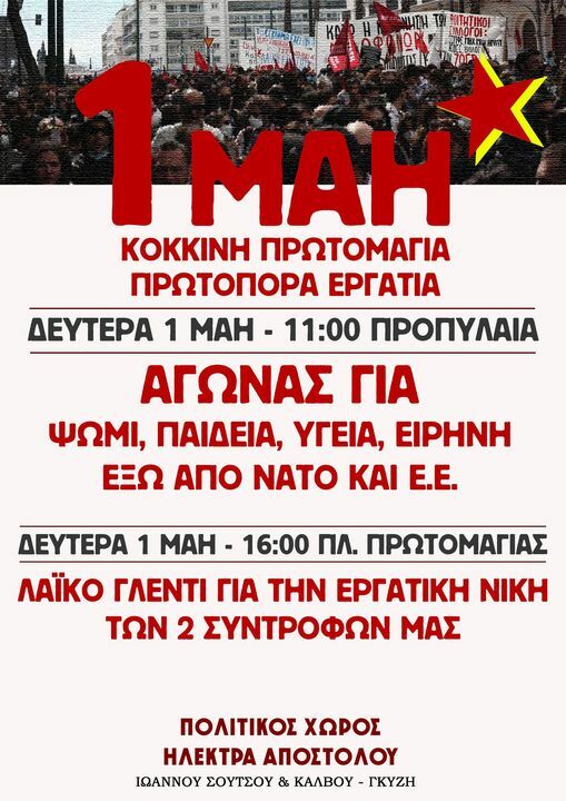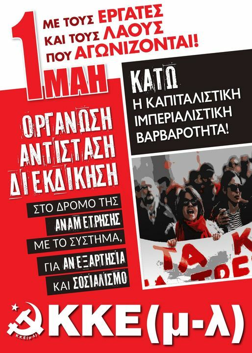 Καλούμε την εργατική τάξη, τον λαό και την νεολαία να διαδηλώσουμε μαζικά και δυναμικά την 1η του Μάη, να τιμήσουμε την Κόκκινη Πρωτομαγιά, τους νεκρούς και τις νεκρές της τάξης μας, να στήσουμε τις βάσεις για την οργάνωση μαζικού-μαχητικού- πανεργατικού παλλαϊκού κινήματος για ψωμί-παιδεία-υγεία-ελευθερία-ειρήνη και αποδέσμευση από ΝΑΤΟ-ΕΕ.