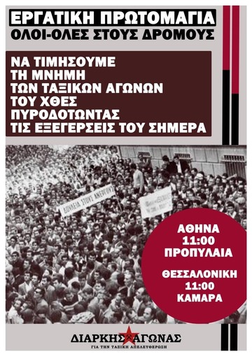 Είναι φανερό πως η υποχώρηση του εργατικού κινήματος τα τελευταία χρόνια έχει δώσει το περιθώριο στο κεφάλαιο και το κράτος να εντείνουν την επίθεση τους στα κεκτημένα της τάξης μας. Όσο και να προσπαθούν να μας πείσουν ότι η ταξική πάλη δεν υφίσταται και πως εκμεταλλευτές και εκμεταλλευόμενοι μπορούν να έχουν κοινά συμφέροντα εμείς δεν τρέφουμε αυταπάτες. Ξέρουμε καλά ότι αυτοί που παρασιτούν από τον ιδρώτα μας θα είναι αμείλικτοι απέναντι μας. Γιατί τα δικαιώματα μας μπαίνουν εμπόδιο στα κέρδη τους και αν δεν τα υπερασπιστούμε θα κάνουν τα πάντα για να τα χάσουμε. Με όπλο μας την ταξική αλληλεγγύη και την οργάνωση στη βάση, στα σωματεία, τους χώρους εργασίας, τις γειτονιές και τις σχολές, να αντεπιτεθούμε συλλογικά στους αντεργατικούς και αντικοινωνικούς νόμους που φέρουν την περαιτέρω υποτίμηση και φτωχοποίησή μας. Συμμετέχουμε και στηρίζουμε τις απεργίες και τις διαδηλώσεις, στοχεύοντας όχι μόνο στη διατήρηση της ιστορικής μνήμης και των αγώνων που έχουν δοθεί αλλά παλεύοντας στο σήμερα για την κατάργηση του συστήματος εκμετάλλευσης και κανιβαλισμού ανθρώπου από άνθρωπο.