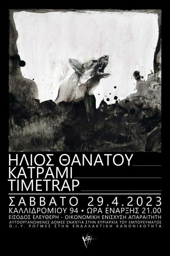 Πλησιάζουμε στο τέλος της σαιζόν καθώς κλείνει κι ο Απρίλιος. Μένουν οι πολιτικές σχέσεις που διαμορφώνουμε επάνω στις θέσεις του πολιτικού D.I.Y. Κάπως έτσι φυσικά, γεννήθηκε και το εν λόγω live, με Ήλιος Θανάτου, Κατράμι και Timetrap. Σάββατο 29 του Απρίλη από τις 21:00. Στηρίζουμε τις D.I.Y. μπάντες και τους χώρους, όχι ως θεατές, αλλά ως αναπόσπαστο κομμάτι της σκηνής. Το μπαρ λειτουργεί με ελεύθερη συνεισφορά. Τα έσοδα διατίθενται για την οικονομική ενίσχυση του χώρου.